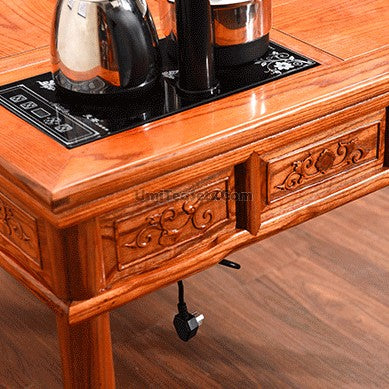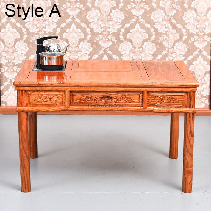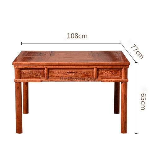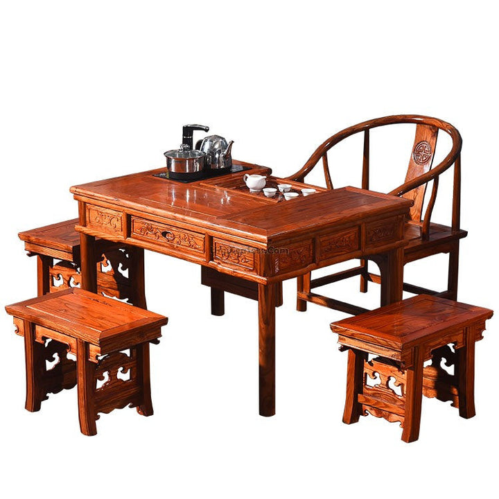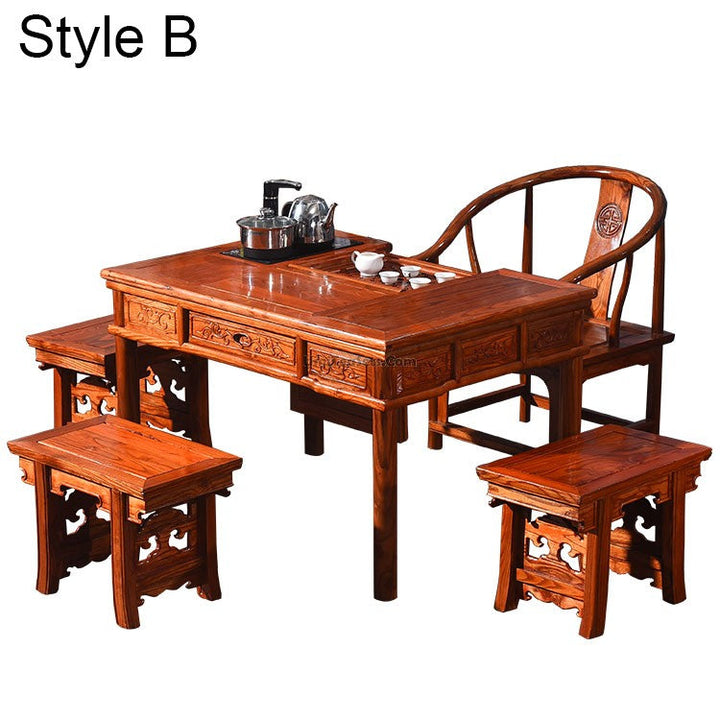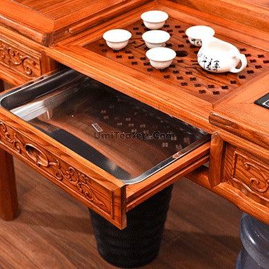 Chinese tea table is a teaware that used for brewing tea, washing tea items, pumping and drawing water. Chinese people like to drinking tea and tasting the true meaning of life when brew tea on a gongfu tea table. Tea table also is a tool for drinking tea. With it, drinking tea will be more enjoyable. The tea brewing process is complicated, but you can brewing tea on it more easily. Chinese Vintage Gong Fu Tea Table With Stools is actually a multi-functional table. It not only will provide an elegant platform to display your tea set, tea and tea accessories when in use. It also makes a ideal gift for tea lover, because to stand it on office or house, it will be a perfect decoration and a table to entertain guest. Gongfu tea table is the most representative ceremony in China's ancient tea culture. This is not only because tea has a health-care function in many respects, but since ancient times, tea has the artistic conception of ""waiting for a gentleman and clearing the body"". Therefore, own this Gongfu tea table to brew tea will be the most healthy way to drink tea. Style A Includes 1 Kung Fu Tea Table, 1 Stainless Steel Teapot, 1 Stainless Steel Wash Pot, 1 Induction Cooker.Kung Fu Tea Table Length 108 cm (42.51"), Width 80 cm (31.49"), Height 68 cm (26.77"). Style BIncludes 1 Kung Fu Tea Table, 1 Host Chair, 3 Guest Chairs, 1 Stainless Steel Teapot, 1 Stainless Steel Wash Pot, 1 Induction Cooker. Kung Fu Tea Table Length 108 cm (42.51"), Width 80 cm (31.49"), Height 68 cm (26.77"). Host Chair Length 58 cm (22.83"), Width 90 cm (35.43"), Height 36 cm (14.17"). Guest Chair Length 50 cm (19.68"), Width 32 cm (12.59"), Height 39 cm (15.35"). Once your order has placed, it would take about 10-15 days to make and produce the tea table and chairs, and we will ship them out in next 48 hours then. The shipping time would take 9-15 days. So we hope you can be patient to wait for it.Chinese Vintage Gong Fu Tea Table With Stools will be a luxurious Chinese decoration on office or house as a exquisite craftsmanship. Tea tastings on this works of art are a very special experience.Chinese Vintage Gong Fu Tea Table With Stools will be a luxurious Chinese decoration on office or house as a exquisite craftsmanship. Tea tastings on this works of art are a very special experience.
