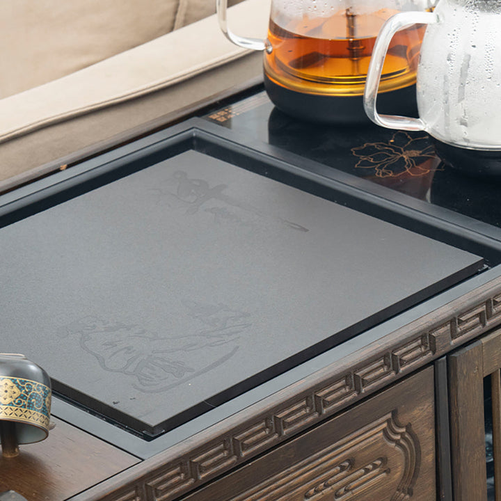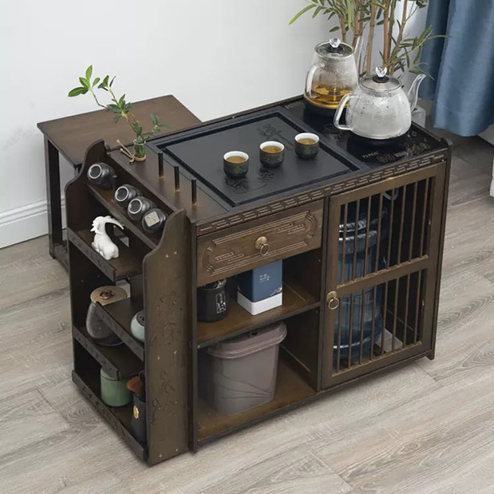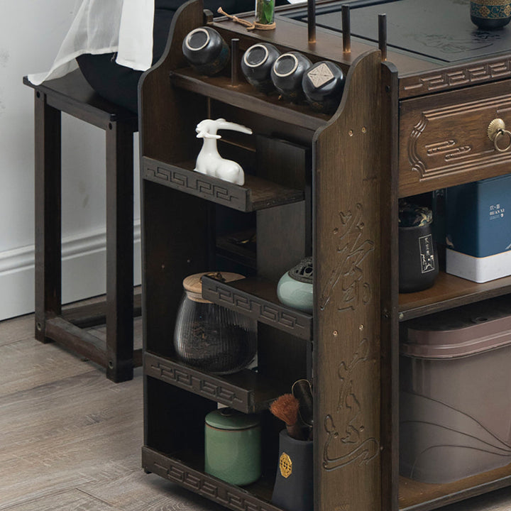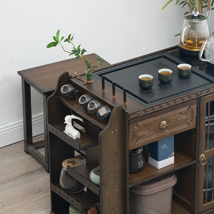 Movable Integrated Chinese Tea Cart is a piece of furniture that integrates tea set, tea storage, and tea brewing functions, and is usually used in Chinese tea ceremonies. It is made of wood and has a flat surface with several storage drawers and cabinets for storing tea sets and tea leaves. The bottom of the tea cart has four small wheels for easy movement and transportation, and can be pushed into a cupboard or corner when not in use to save space. The top of the tea cart is a simple tea tray for drinking tea and performing tea ceremonies. The bottom of the tea cart can also accommodate a sink or water bottle for adding and discharging water. The tea cart is also equipped with a built-in hot water kettle and heater for use when brewing tea.