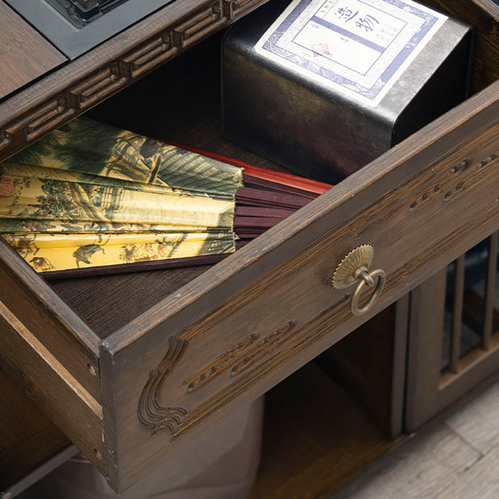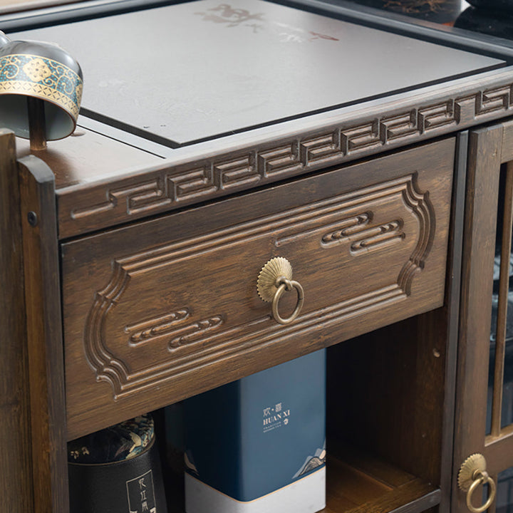 Movable Integrated Chinese Tea Cart is a piece of furniture that integrates tea set, tea storage, and tea brewing functions, and is usually used in Chinese tea ceremonies. It is made of wood and has a flat surface with several storage drawers and cabinets for storing tea sets and tea leaves. The bottom of the tea cart has four small wheels for easy movement and transportation, and can be pushed into a cupboard or corner when not in use to save space. The top of the tea cart is a simple tea tray for drinking tea and performing tea ceremonies. The bottom of the tea cart can also accommodate a sink or water bottle for adding and discharging water. The tea cart is also equipped with a built-in hot water kettle and heater for use when brewing tea.The design and production of the tea cart follow the traditional Chinese furniture style, using high-quality wood and exquisite carving to enhance the aesthetic value. Therefore, the tea cart is not only a practical piece of furniture, but also has high artistic and cultural value, and is an important part of traditional Chinese culture.Size Length 69 cm (27.1 inches), Width 40 cm (15.7 inches), Height 66 cm (25.9 inches)Movable Integrated Chinese Bamboo Tea Table will be a luxurious Chinese decoration on office or house as a exquisite craftsmanship. Tea tastings on this works of art are a very special experience.Movable Integrated Chinese Bamboo Tea Table will be a luxurious Chinese decoration on office or house as a exquisite craftsmanship. Tea tastings on this works of art are a very special experience.